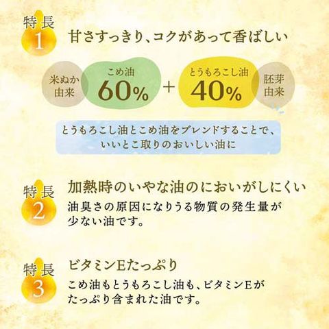 ●こめ油ととうもろこし油をブレンドした、軽やかなおいしさの調合こめ油です。