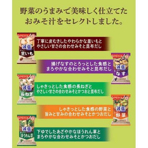 ●一瞬で、作りたてのようなおいしさ、まるで手作りのようなおいしさを手軽に味わえる「減塩※いつものおみそ汁」シリーズのバラエティセットです。