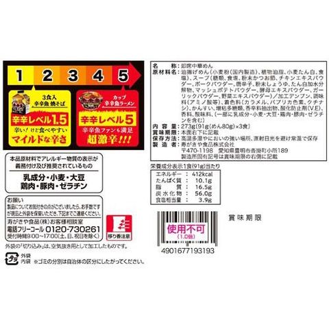 | 油揚げめん(小麦粉(国内製造)、植物油脂、小麦たん白、食塩)、スープ(糖類、食塩、粉末かつお節、チキンエキスパウダー、ポークパウダー、唐辛子、粉末しょうゆ、たん白加水分解物、マッシュポテトパウダー、酵母エキスパウダー、ガーリックパウダー、野菜エキスパウダー)/加工デンプン、調味料(アミノ酸等)、着色料(カラメル、パプリカ色素、クチナシ)、かんすい、増粘多糖類、香辛料抽出物、酸化防止剤(V.E)、香料、酸味料、(一部に乳成分・小麦・大豆・鶏肉・豚肉・ゼラチンを含む) |