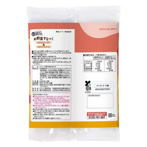 | 1袋(6g)あたり ★お野菜スナック(にんじん+トマト) エネルギー:23kcal、たんぱく質:0.44g、脂質:0.12g、炭水化物:5.0g、食塩相当量:0.040g、カルシウム:33mg ★お野菜スナック(かぼちゃ+おいも) エネルギー:23kcal、たんぱく質:0.44g、脂質:0.12g、炭水化物:5.1g、食塩相当量:0.035g、カルシウム:30mg |