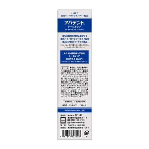 | 溶剤:精製水/基剤:歯磨用リン酸水素カルシウム/湿潤剤:濃グリセリン/薬用成分:薬用ハイドロキシアパタイト、ポリエチレングリコール400、ポリビニルピロリドン、β-グリチルレチン酸、塩化セチルピリジニウム、塩酸ピリドキシン/増粘剤:無水ケイ酸/発泡剤:ラウリル硫酸ナトリウム、ラウロイルサルコシンナトリウム/粘結剤:カルボキシメチルセルロースナトリウム/香味剤:香料(ペパーミントタイプ)、サッカリンナトリウム/矯味剤:チャ乾留液、セージエキス、カモミラエキス(1)/安定剤:リン酸マグネシウム/保存剤:塩酸アルキルジアミノエチルグリシン液 |