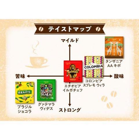 | コーヒー豆(生豆生産国名:下記記載) ・ブラジル ショコラ:ブラジル ・コロンビア スプレモ ウィラ:コロンビア ・グァテマラ ヴィデス:グァテマラ ・エチオピア イルガチェフ:エチオピア ・タンザニアAA キボ:タンザニア |