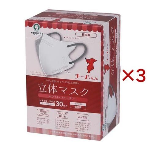チーバくん 立体マスク レギュラーサイズ 個包装 ホワイト×ライトグレー (30枚入×3セット)