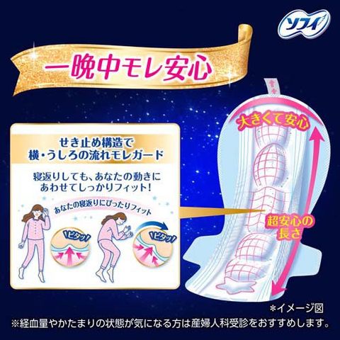 ●せき止め構造で横・うしろの流れモレをガードし、寝返りモレ0へ。多い日の夜でも安心して超熟睡できます。