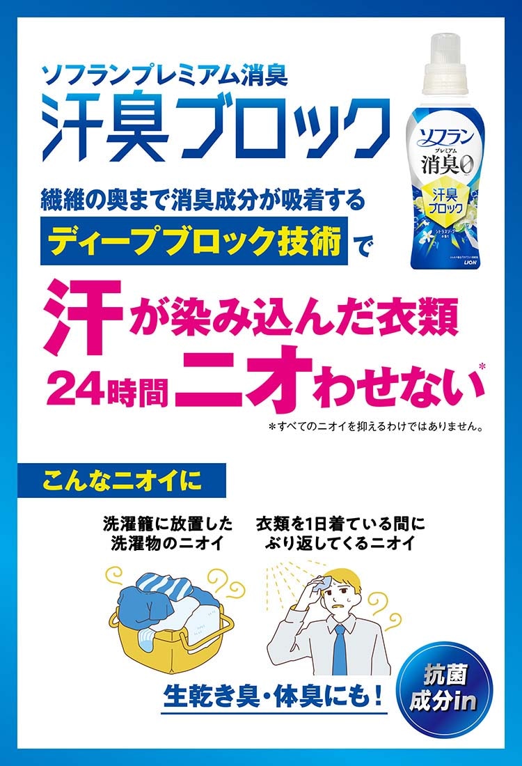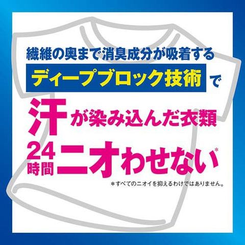 ●繊維の奥まで消臭成分が吸着するディープブロック技術で、汗が染み込んだ衣類も24時間ニオわせない※1。