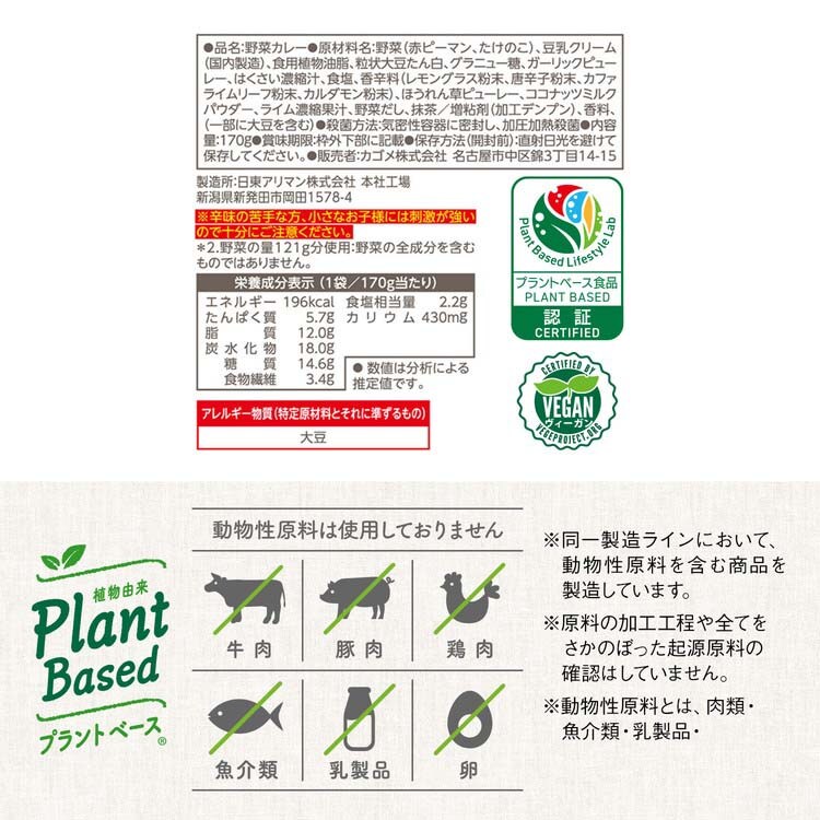 | 野菜(赤ピーマン、たけのこ)、豆乳クリーム(国内製造)、食用植物油脂、粒状大豆たん白、グラニュー糖、ガーリックピューレー、はくさい濃縮汁、食塩、香辛料(レモングラス粉末、唐辛子粉末、カファライムリーフ粉末、カルダモン粉末)、ほうれん草ピューレー、ココナッツミルクパウダー、ライム濃縮果汁、野菜だし、抹茶/増粘剤(加工デンプン)、香料、(一部に大豆を含む) |