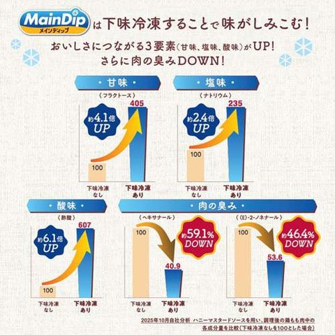 ●献立をストックする、お肉専用下味冷凍調味料。マイルドなカレー味にチーズのコクを効かせた味わいは、鶏もも肉とトマトにおすすめです。