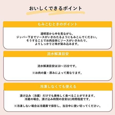 ・下ごしらえ済みの本品をあらかじめ冷蔵庫に移し、完全に解凍しておく。 目安:夕食用の場合、前日の夜または当日の朝に冷蔵庫に移す。 ※お急ぎの場合は流水解凍。
