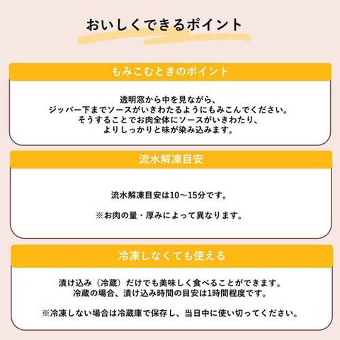 ・下ごしらえ済みの本品をあらかじめ冷蔵庫に移し、完全に解凍しておく。 目安:夕食用の場合、前日の夜または当日の朝に冷蔵庫に移す。 ※お急ぎの場合は流水解凍。
