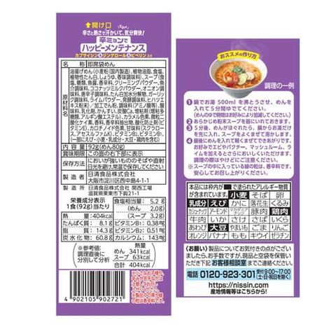| 油揚げめん(小麦粉(国内製造)、植物油脂、食塩、植物性たん白、しょうゆ、香味調味料)、スープ(食塩、糖類、魚醤、香辛料、クリーミングパウダー、魚介調味料、ココナッツミルクパウダー、オニオン調味料、唐辛子調味料、たん白加水分解物、ガーリック調味料、ライムパウダー、発酵調味料、ヒハツエキス粉末)/加工でん粉、調味料(アミノ酸等)、酸味料、乳化剤、かんすい、炭酸Ca、増粘剤(増粘多糖類、アルギン酸エステル)、カラメル色素、微粒二酸化ケイ素、香料、香辛料抽出物、酸化防止剤(ビタミンE)、カロチノイド色素、甘味料(スクラロース、アセスルファムK)、ビタミンB2、ビタミンB1、(一部にえび・小麦・乳成分・大豆・鶏肉を含む) |