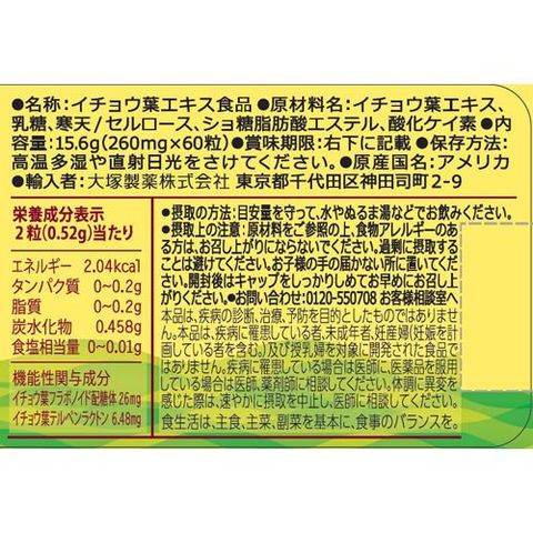 | (2粒(0.52g)当たり) エネルギー・・・2.04kcal タンパク質・・・0~0.2g 脂質・・・0~0.2g 炭水化物・・・0.458g 食塩相当量・・・0~0.01g (機能性関与成分) イチョウ葉フラボノイド配糖体・・・26mg イチョウ葉テルペンラクトン・・・6.48mg |