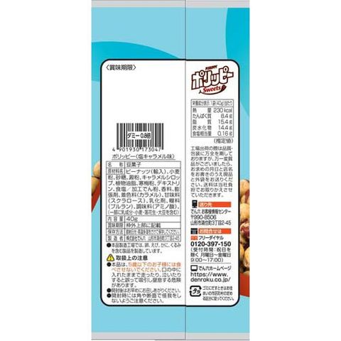ピーナッツ(輸入)、小麦粉、砂糖、澱粉、キャラメルシロップ、植物油脂、寒梅粉、デキストリン、食塩/加工でん粉、香料、膨張剤、着色料(カラメル)、甘味料(スクラロース)、乳化剤、糊料(プルラン)、調味料(アミノ酸)、(一部に乳成分・小麦・落花生・大豆を含む)
