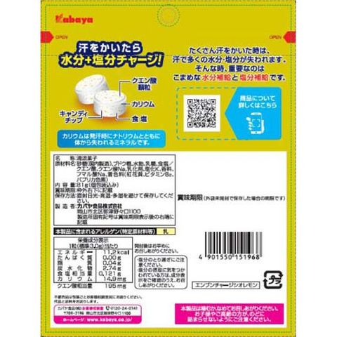 | 砂糖(国内製造)、ブドウ糖、水飴、乳糖、食塩/クエン酸、クエン酸Na、乳化剤、塩化K、香料、フマル酸Na、着色料(紅花黄、ビタミンB2、パプリカ色素) |