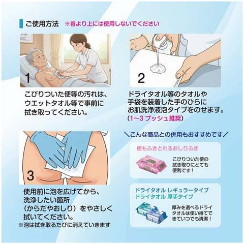 (3)使用前に泡をドライタオルや手のひらの上で広げてから、からだやおしりを拭いてください。