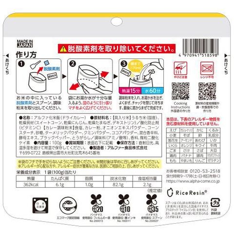 | 具入り米:うるち米(国産)、乾燥具材(スイートコーン、乾燥にんじん、乾燥たまねぎ、デキストリン)/酸化防止剤(ビタミンC) カレー調味粉末:食塩、カレー粉、オニオンエキスパウダー、コーンスターチ、砂糖、ターメリックパウダー、クミンパウダー、ココアパウダー、混合香辛料、酵母エキス、ブラックペッパー、とうがらし/調味料(アミノ酸等)、香料、微粒二酸化ケイ素 |