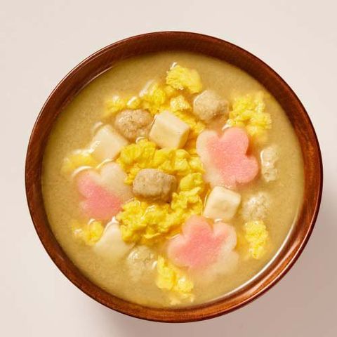 | 顆粒みそ(国内製造)(米みそ、豆みそ、かつお節粉末、食塩、酵母エキス粉末、発酵調味料、かつお節エキス、いわし煮干粉末、昆布粉末)、味付鶏団子(鶏肉、植物性たん白、ラード、その他)、鶏卵加工品、ふ、とうふ/トレハロース、加工デンプン、増粘剤(キサンタンガム)、ソルビトール、調味料(アミノ酸等)、グリセリン、リン酸Na、凝固剤、酸化防止剤(V.E)、着色料(紅麹、カロチン)、香料、(一部に小麦・卵・大豆・鶏肉・豚肉を含む) |
