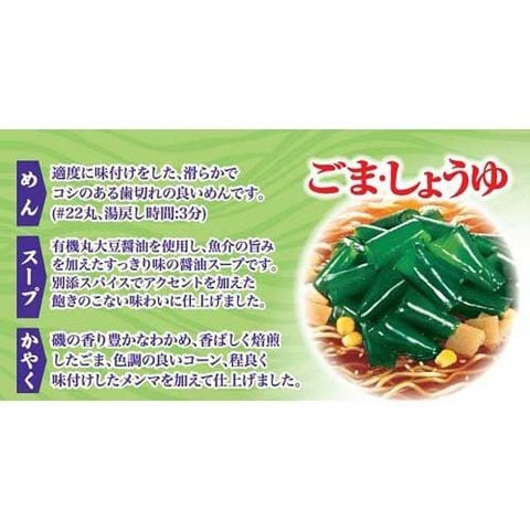 | 油揚げめん(小麦粉(国内製造)、植物油脂、食塩、たん白加水分解物)、スープ(しょうゆ、砂糖、植物油脂、食塩、発酵調味料、たん白加水分解物、魚介エキス、香辛料、酵母エキス、難消化性デキストリン)、かやく(ごま、わかめ、コーン、メンマ)/加工でん粉、調味料(アミノ酸等)、酒精、炭酸Ca、カラメル色素、かんすい、香料、カロチノイド色素、酸化防止剤(ビタミンE)、酸味料、香辛料抽出物、ビタミンB2、ビタミンB1、(一部に小麦、乳成分、ごま、大豆、鶏肉、豚肉を含む) |