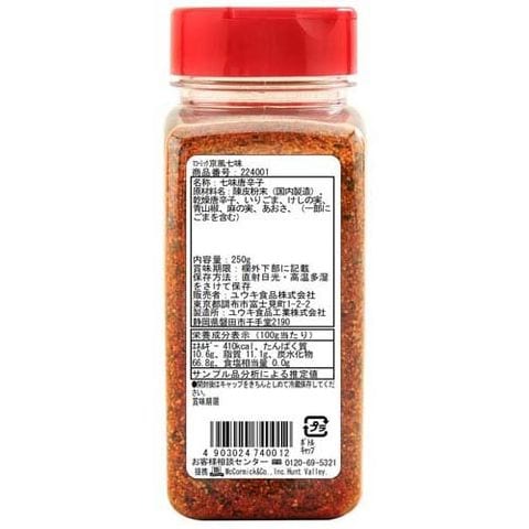 | 陳皮粉末(国内製造)、乾燥唐辛子、いりごま、けしの実、青山椒、麻の実、あおさ、(一部にごまを含む) |