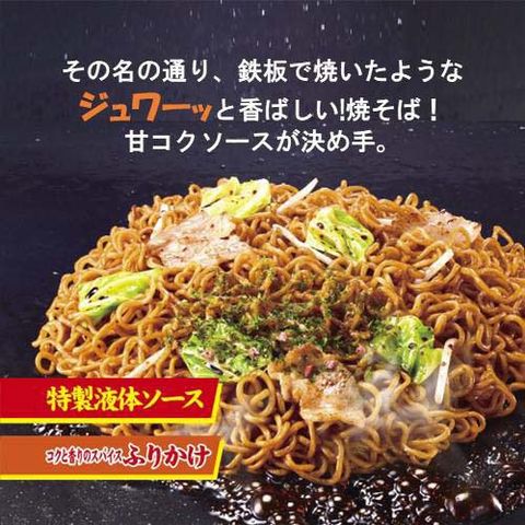 ●鉄板で焼いたような、ジュワーッと香ばしい焼そば!香ばしさを強化。かつおの旨みとソースのコクを活かしながら、奥深い味わいに仕上げた一品です。