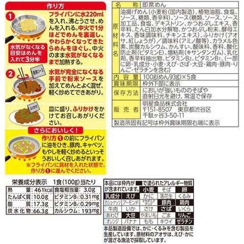 | 油揚げめん(小麦粉(国内製造)、植物油脂、食塩、ソース、糖類、香辛料)、ソース(糖類、ソース、ソース加工品、食塩、デキストリン、かつおぶしエキス、香辛料、たん白加水分解物、かつおぶし粉末、酵母エキス、香味調味料、チキンエキス)、ふりかけ(アオサ、紅しょうが)/調味料(アミノ酸等)、カラメル色素、炭酸カルシウム、かんすい、酸味料、香料、酸化防止剤(ビタミンE)、増粘剤(キサンタンガム)、乳化剤、香辛料抽出物、ビタミンB2、ビタミンB1、(一部に卵・乳成分・小麦・えび・さば・大豆・鶏肉・豚肉・りんご・ゼラチンを含む) |
