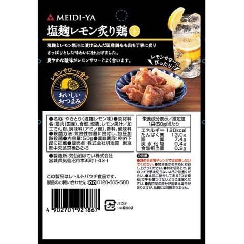 | 鶏肉(国産)、食塩、塩麹、レモン果汁/加工でん粉、調味料(アミノ酸)、香料、酸味料 |