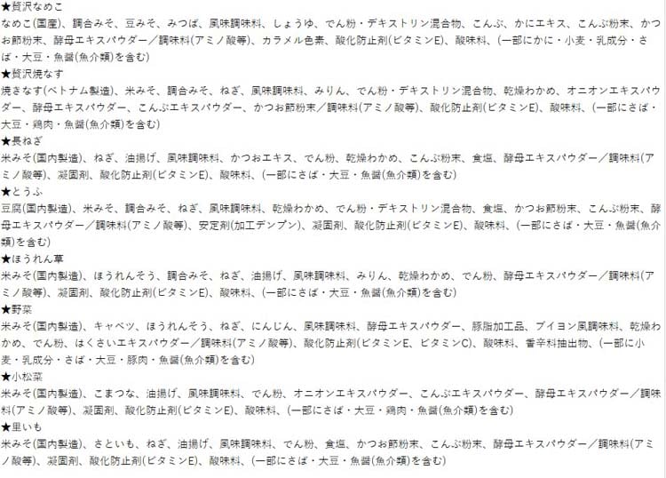 | 贅沢なめこ:かに、小麦、乳、さば、大豆、魚介類 贅沢焼なす:さば、大豆、鶏肉、魚介類 長ねぎ:さば、大豆、魚介類 とうふ:さば、大豆、魚介類 ほうれん草:さば、大豆、魚介類 野菜:小麦、乳、さば、大豆、豚肉、魚介類 小松菜:さば、大豆、鶏肉、魚介類 里いも:さば、大豆、魚介類 |