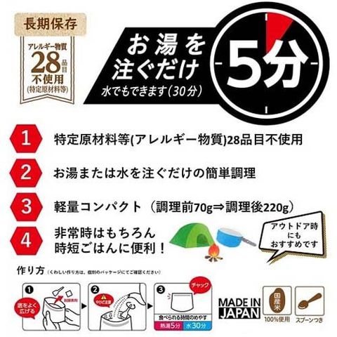 ●お湯または水を注ぐだけの簡単調理。お湯の場合5分、水(15度)の場合30分でご飯が出来上がります。