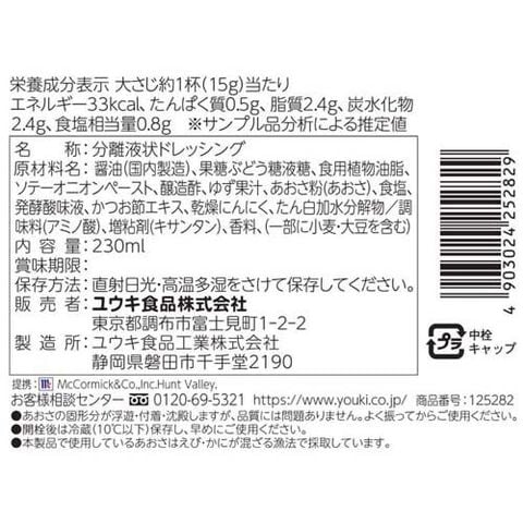 | 醤油(国内製造)、果糖ぶどう糖液糖、食用植物油脂、ソテーオニオンペースト、醸造酢、ゆず果汁、あおさ粉(あおさ)、食塩、発酵酸味液、かつお節エキス、乾燥にんにく、たん白加水分解物/調味料(アミノ酸)、増粘剤(キサンタン)、香料、(一部に小麦・大豆を含む) |