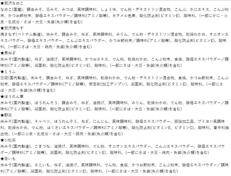 | 贅沢なめこ:かに、小麦、乳、さば、大豆、魚介類 贅沢焼なす:さば、大豆、鶏肉、魚介類 長ねぎ:さば、大豆、魚介類 とうふ:さば、大豆、魚介類 ほうれん草:さば、大豆、魚介類 野菜:小麦、乳、さば、大豆、豚肉、魚介類 小松菜:さば、大豆、鶏肉、魚介類 里いも:さば、大豆、魚介類 |