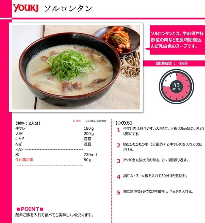 ・ラーメンスープ、ソルロンタン、鍋スープなど。