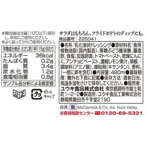 | 食用植物油脂、果糖ぶどう糖液糖、醸造酢、食塩、加塩卵黄、トマトペースト、ガーリックパウダー、アンチョビペースト、濃縮レモン果汁、こしょう/調味料(アミノ酸)、増粘剤(キサンタン)、香料、(一部に卵を含む) |