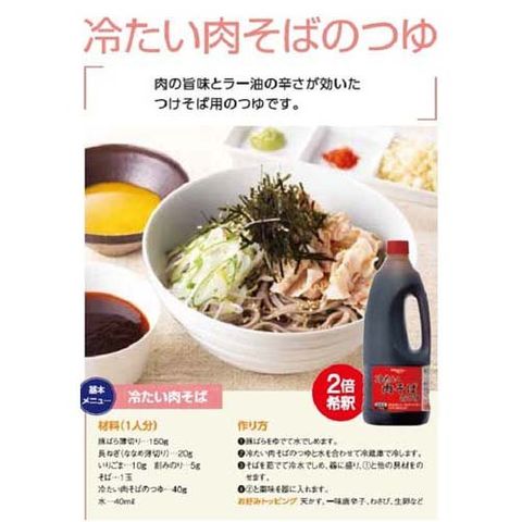 ●肉の旨味とラー油の辛さが効いたおいしさで、そばを食べることができる「冷たい肉そばのつゆ」です。