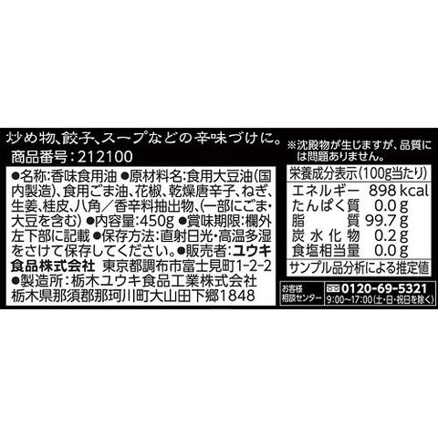 食用大豆油(国内製造)、食用ごま油、花椒、乾燥唐辛子、ねぎ、生姜、桂皮、八角/香辛料抽出物、(一部にごま・大豆を含む)