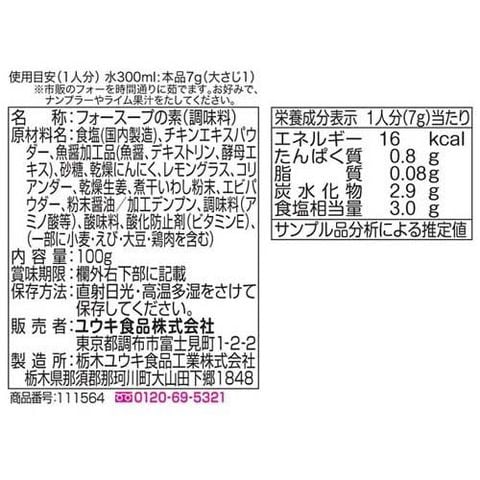 食塩(国内製造)、チキンエキスパウダー、魚醤加工品(魚醤、デキストリン、酵母エキス)、砂糖、乾燥にんにく、レモングラス、コリアンダー、乾燥生姜、煮干いわし粉末、エビパウダー、粉末醤油/加工デンプン、調味料(アミノ酸等)、酸味料、酸化防止剤(ビタミンE)、(一部に小麦・えび・大豆・鶏肉を含む)