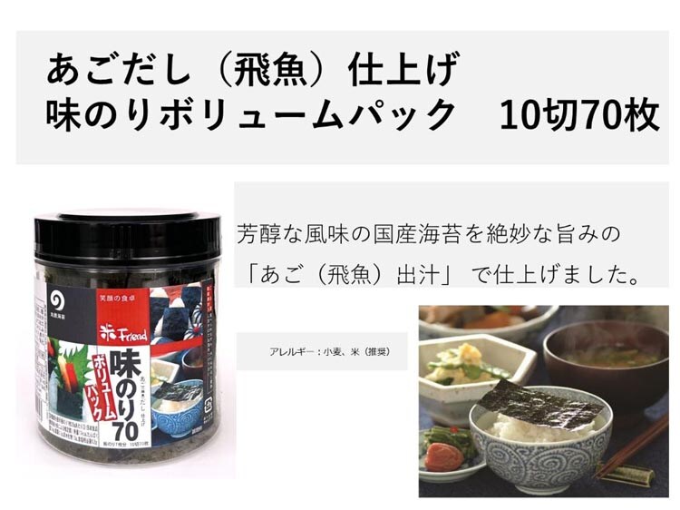 | 乾海苔(国産)、糖類(砂糖、水飴)、蛋白加水分解物、焼きあごだし、かつおエキス、食塩、ホタテエキス、みりん、清酒、酵母エキス、煮干エキス、こんぶエキス/乳化剤、(一部に小麦を含む) |