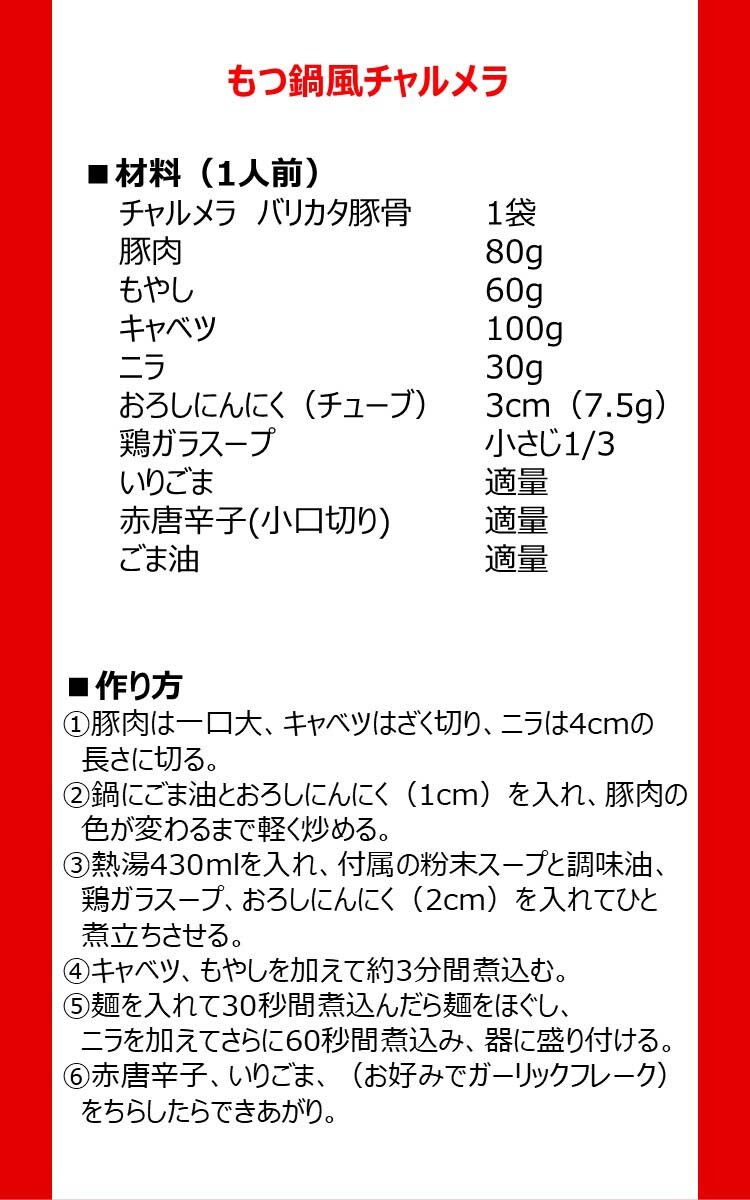 | めん(小麦粉(国内製造)、卵粉、植物油脂、ポークエキス、しょうゆ、食塩)、スープ(食塩、ポークエキス、粉末油脂、油脂加工品、たん白加水分解物、豚脂、乳等を主要原料とする食品、糖類、ごま、香辛料(ガーリック、ペッパー)、植物油脂、紅しょうが、酵母エキス、ホタテエキス、香味調味料)/調味料(アミノ酸等)、かんすい、炭酸カルシウム、増粘多糖類、卵殻カルシウム、炭酸マグネシウム、香料、微粒二酸化ケイ素、酸化防止剤(ビタミンE)、カラメル色素、乳化剤、甘味料(スクラロース)、ビタミンB2、ビタミンB1、酸味料、(一部に卵・乳成分・小麦・えび・ごま・大豆・鶏肉・豚肉を含む) |