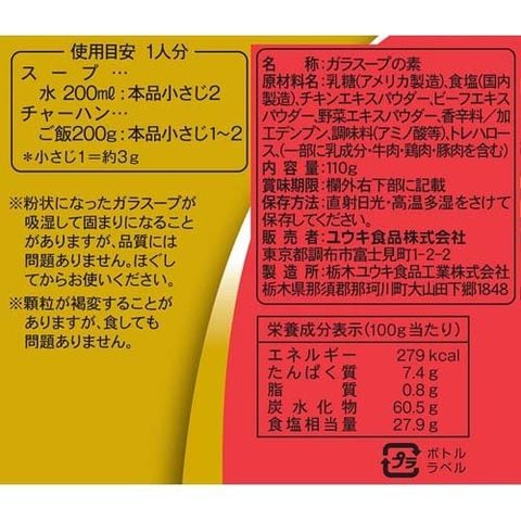 ・粉状になったガラスープが吸湿して固まりになることがありますが、品質には問題ありません。ほぐしてからお使いください。