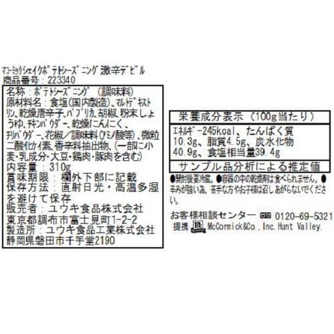 | 食塩(国内製造)、マルトデキストリン、乾燥唐辛子、パプリカ、胡椒、粉末しょうゆ、チキンパウダー、乾燥にんにく、チリパウダー、花椒/調味料(アミノ酸等)、微粒二酸化ケイ素、香辛料抽出物、(一部に小麦・乳成分・大豆・鶏肉・豚肉を含む) |