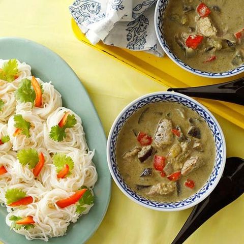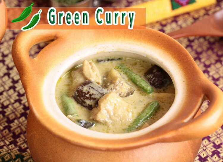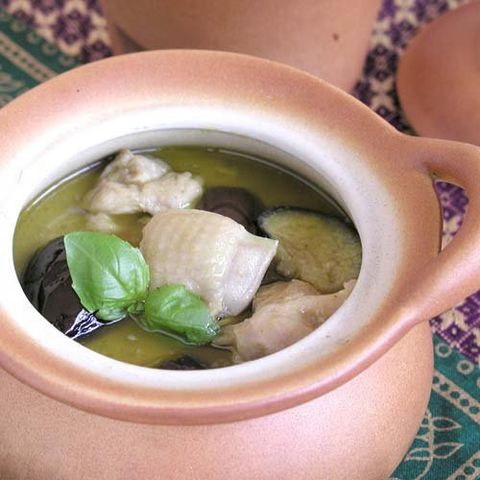 ●使用目安(4人分):本品50g、ココナッツミルク400ml、水100ml、ナンプラー大さじ1杯・砂糖大さじ1杯、具材:鶏もも肉1枚、なす2本、いんげん10本