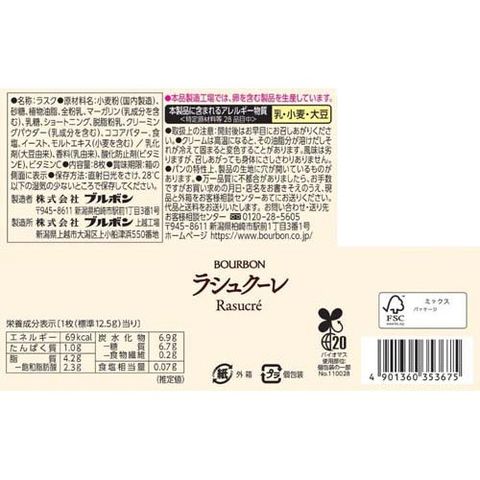 | 小麦粉(国内製造)、砂糖、植物油脂、全粉乳、マーガリン(乳成分を含む)、乳糖、ショートニング、脱脂粉乳、クリーミングパウダー(乳成分を含む)、ココアバター、食塩、イースト、モルトエキス(小麦を含む)/乳化剤(大豆由来)、香料(乳由来)、酸化防止剤(ビタミンE)、ビタミンC |