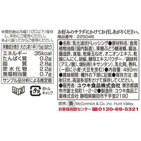 食用植物油脂(国内製造)、果糖ぶどう糖液糖、醤油、醸造酢、食塩、乾燥玉ねぎ、オニオンエキス、乾燥にんにく、胡椒、酵母エキスパウダー/調味料(アミノ酸)、増粘剤(キサンタン)、乳化剤、香料、(一部に小麦・大豆を含む)