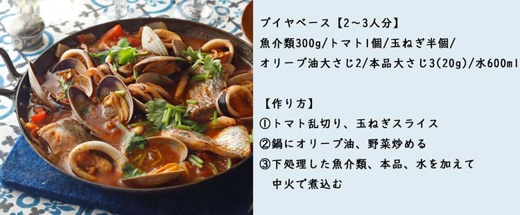 お好みの材料を煮込むだけで簡単にブイヤベースの味付けができます。