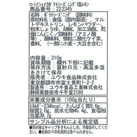 | 食塩(国内製造)、マルトデキストリン、レモンパウダー、粉末しょうゆ、胡椒、加工油脂、乾燥にんにく/調味料(アミノ酸等)、酸味料、微粒二酸化ケイ素、香料、(一部に小麦・大豆を含む) |