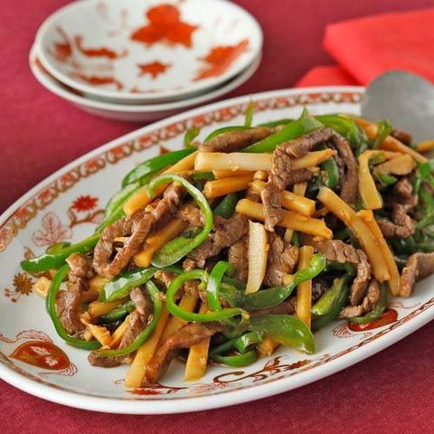 材料:豚or牛肉薄切り250g、ピーマン4個、タケノコ水煮細切100g、もやし1袋、本品1袋、醤油・酒・片栗粉・油:適量