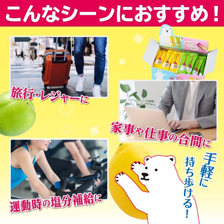 | ★レモン 砂糖(国内製造)、果糖ぶどう糖液糖、レモン果汁、食塩/酸味料、ゲル化剤(増粘多糖類)、香料 ★ウメ 砂糖(国内製造)、果糖ぶどう糖液糖、うめ果汁、食塩/酸味料、ゲル化剤(増粘多糖類)、香料 |
