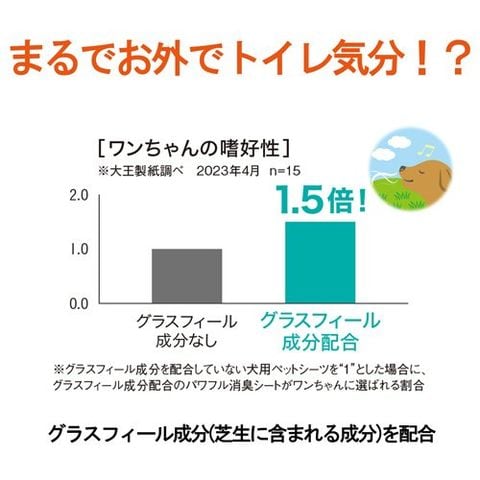 ●グラスフィール成分配合 ワンちゃんが芝生を感じる成分配合で、まるでお外でトイレをしている気分に!