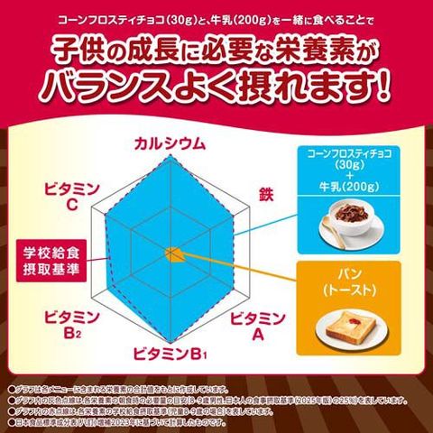 ●学校給食摂取基準に準拠したビタミン・ミネラル(ビタミンA・B1・B2・C・カルシウム・鉄)が摂れる、栄養まるごと※1のシリアル。