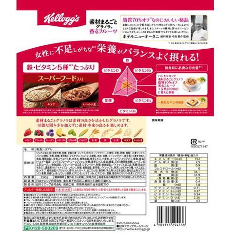 シリアル加工品(全粒大麦、砂糖、全粒小麦、シリアルパフ(コーンフラワー、小麦粉、米粉、砂糖、食塩)、小麦シリアルパフ(小麦粉、米粉、砂糖、麦芽粉)、マルチグレインパフ(小麦粉、米粉、砂糖、コーンフラワー、麦芽粉(小麦を含む)、食塩、植物油脂)、全粒スペルト小麦、水あめ、植物油脂、麦芽エキス、小麦粉、オーツパフ、キヌアパフ、糖蜜、食塩)(ベルギー製造)、シリアルフレーク(コーングリッツ、砂糖、麦芽エキス、食塩、蜂蜜、ぶどう糖果糖液糖)、レーズン加工品(レーズン、植物油脂)、クランベリー加工品(クランベリー、砂糖、植物油脂)、パイナップル加工品(乳糖(乳成分を含む)、濃縮果汁(パイナップル、レモン)、砂糖、植物油脂、麦芽糖、パイナップル、寒天)、かぼちゃの種、イチゴ加工品(イチゴ、植物油脂)/グリセリン、香料、セルロース、加工でん粉、酸味料、乳化剤(大豆を含む)、酸化防止剤(ビタミンE)、重曹、炭酸Ca、鉄、ピロリン酸鉄、ビタミンB2、ビタミンB6、ビタミンB1、葉酸、着色料(クチナシ色素)、ビタミンD