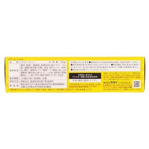 | 鶏肉(国産)、豚脂肪、結着材料(粗ゼラチン、でん粉)、糖類(麦芽糖、砂糖)、食塩、豚コラーゲン、香辛料、豚肉/調味料(アミノ酸等)、リン酸塩(Na)、pH調整剤、酸化防止剤(V.C)、くん液、発色剤(亜硝酸Na)、(一部に牛肉・鶏肉・豚肉・ゼラチンを含む) |
