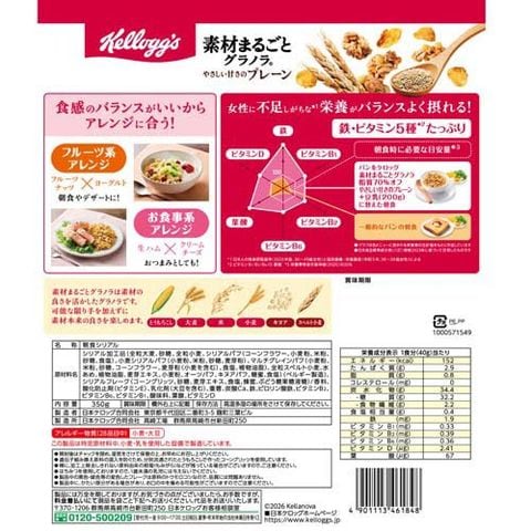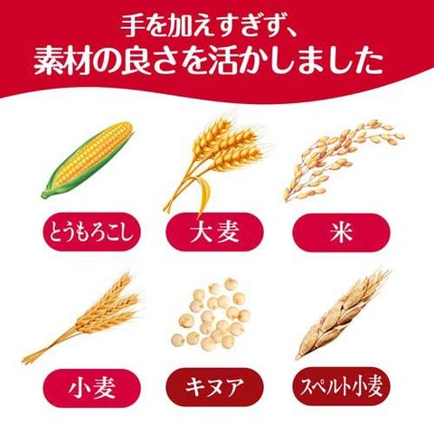 シリアル加工品(全粒大麦、砂糖、全粒小麦、シリアルパフ(コーンフラワー、小麦粉、米粉、砂糖、食塩)、小麦シリアルパフ(小麦粉、米粉、砂糖、麦芽粉)、マルチグレインパフ(小麦粉、米粉、砂糖、コーンフラワー、麦芽粉(小麦を含む)、食塩、植物油脂)、全粒スペルト小麦、水あめ、植物油脂、麦芽エキス、小麦粉、オーツパフ、キヌアパフ、糖蜜、食塩)(ベルギー製造)、シリアルフレーク(コーングリッツ、砂糖、麦芽エキス、食塩、蜂蜜、ぶどう糖果糖液糖)/香料、酸化防止剤(ビタミンE)、乳化剤(大豆を含む)、重曹、炭酸Ca、鉄、ピロリン酸鉄、ビタミンB2、ビタミンB6、ビタミンB1、酸味料、葉酸、ビタミンD